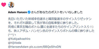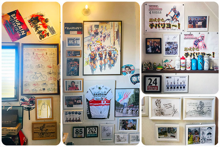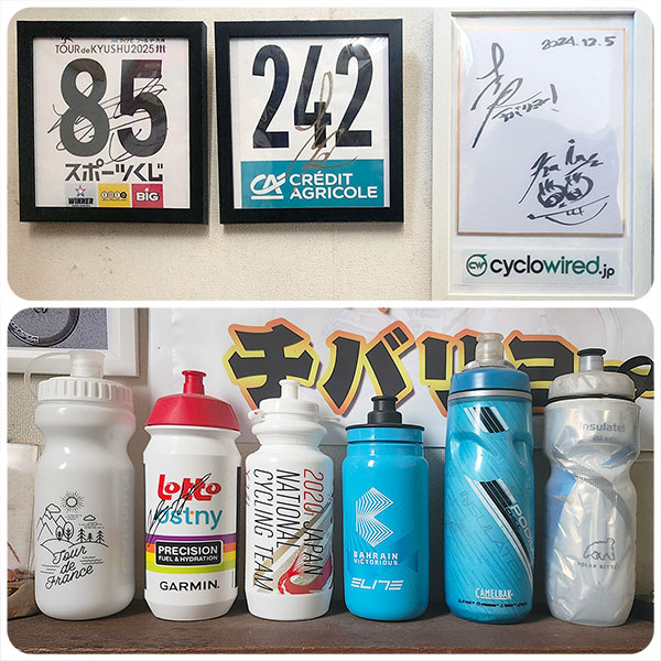我が家の自転車壁は、サイン入りフィギュア、ボトル、ゼッケン、写真、横断幕などで満員御礼です。