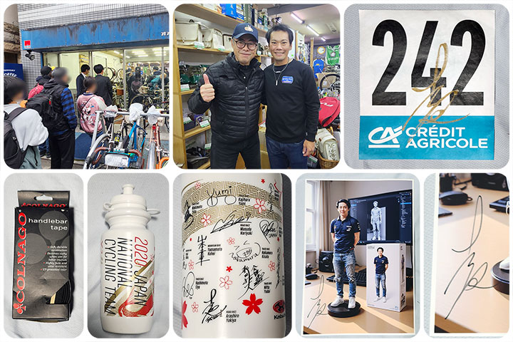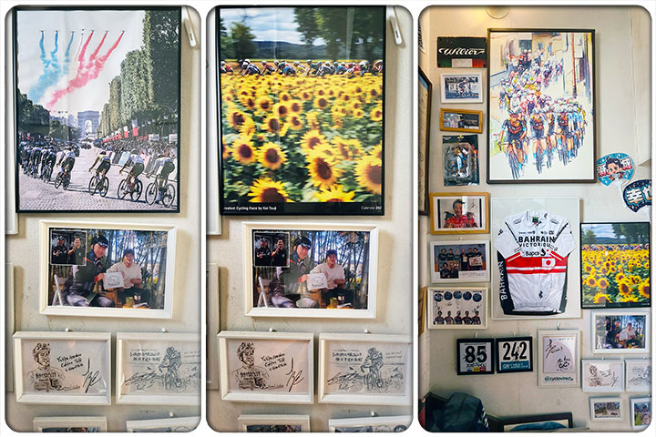 写真に収まり切れていませんが、他にも渡辺航先生のサイン入りード、その他自転車選手や関係者のサインやグッヅがまだまだたくさんあり、もう壁のスペースがありません(笑)。
