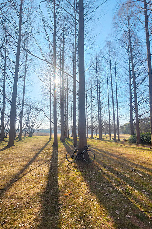 新年初ライドは竹林カフェ風で珈琲飲んで帰る予定でしたが、日陰の道は残雪と凍結でロードバイク出動は危険と判断。