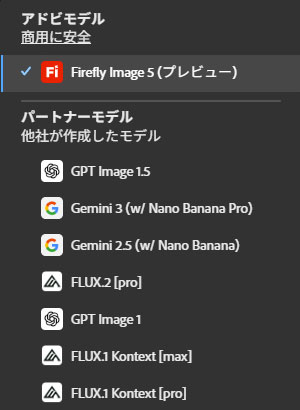 これを書いている現在 Firefly Image5 の他に GPT、Gemini、FLUX も指定できます。