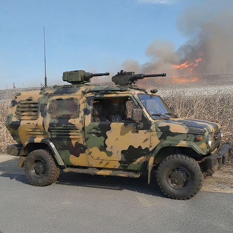 黄色のボデイはそのままで、戦闘車両風にアレンジ。背景も正に戦場の光景。