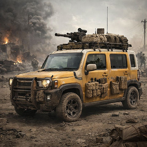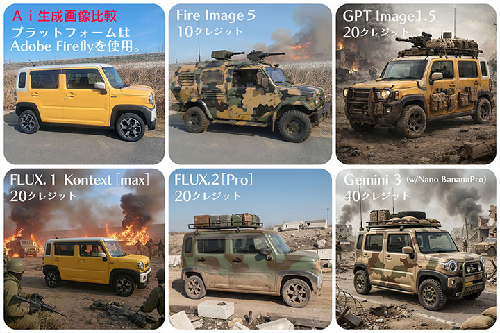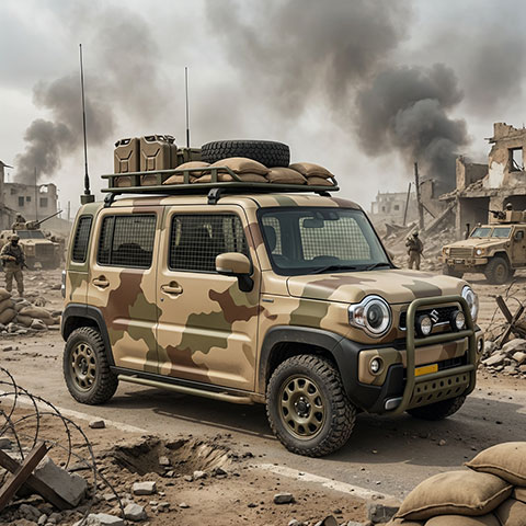 そして戦場なのに、そこに新車のハスラーを無理に合成した様な画像で、リアリティは欠如。